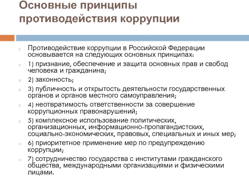 Основные принципы противодействия коррупции Противодействие коррупции в Российской Федерации основывается на следующих основных принципах:1) признание, обеспечение и