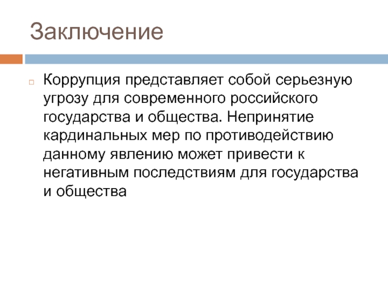 ЗаключениеКоррупция представляет собой серьезную угрозу для современного российского государства и общества. Непринятие кардинальных мер по противодействию данному