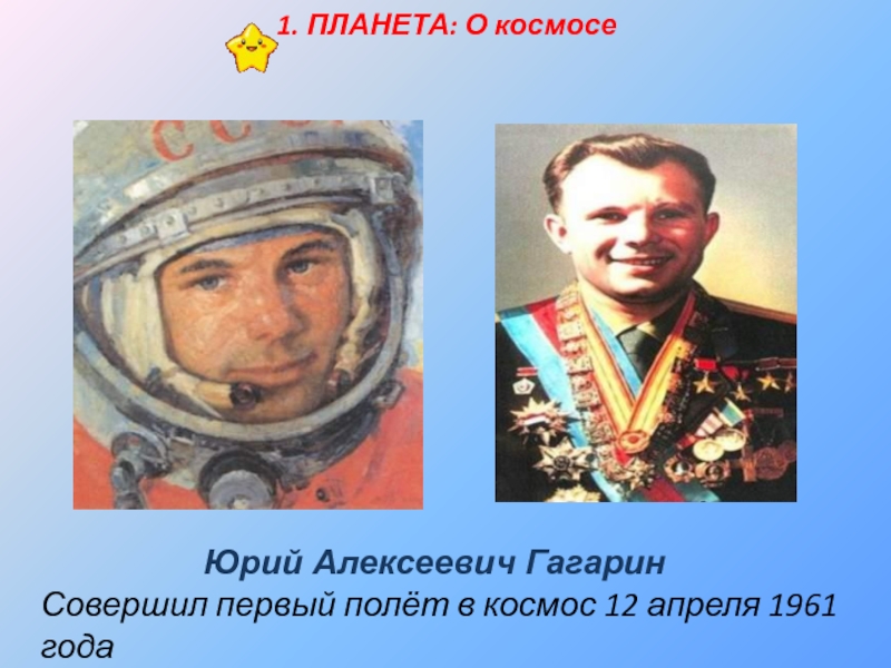 1. ПЛАНЕТА: О космосе          Юрий Алексеевич ГагаринСовершил первый