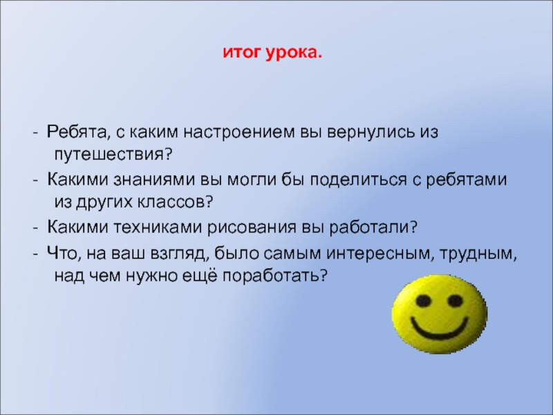 итог урока.- Ребята, с каким настроением вы вернулись из путешествия? - Какими знаниями вы могли бы
