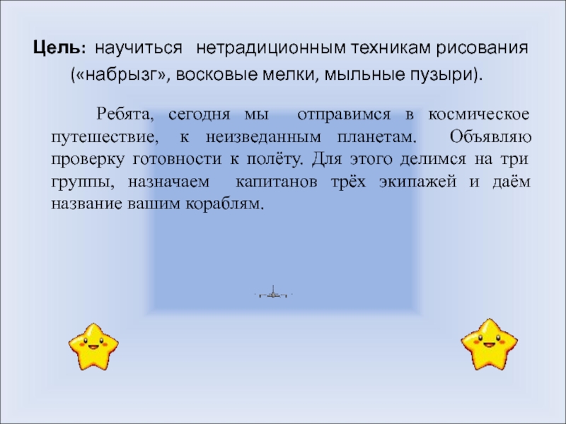Цель: научиться нетрадиционным техникам рисования («набрызг», восковые мелки, мыльные пузыри). Ребята, сегодня мы отправимся в космическое путешествие,  к неизведанным планетам. Объявляю проверку готовности к полёту. Для этого