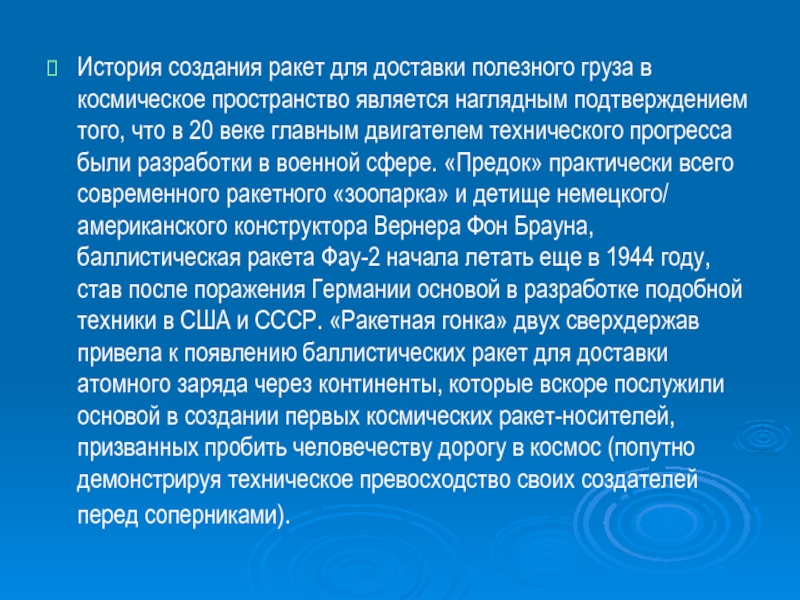 технического прогресса были разработки в военной сфере. «Предок» практически всего современного ракетного «зоопарка» и детище немецкого/ американского конструктора Вернера Фон Брауна, баллистическая ракета Фау-2 начала летать еще в 1944 году, став после поражения Германии основой в разработке подобной техники в США и СССР. «Ракетная гонка» двух сверхдержав привела к появлению баллистических ракет для доставки атомного заряда через континенты, которые вскоре послужили основой в создании первых космических ракет-носителей, призванных пробить человечеству дорогу в космос (попутно демонстрируя техническое превосходство своих создателей перед соперниками).
