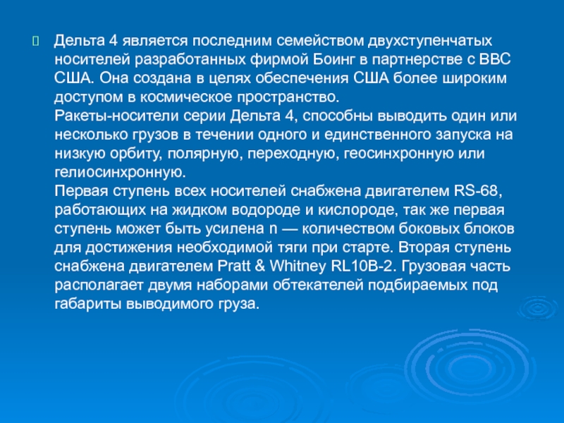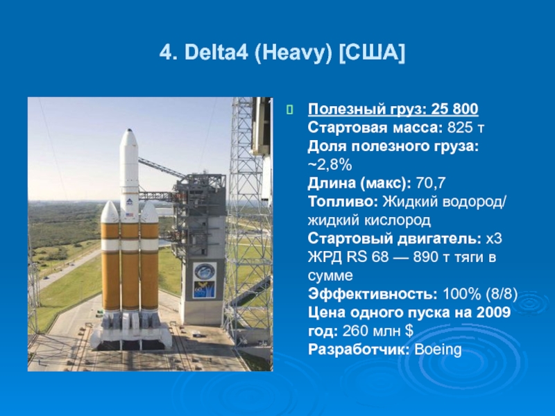 Слайд 19Дельта 4 является последним семейством двухступенчатых носителей разработанных фирмой Боинг