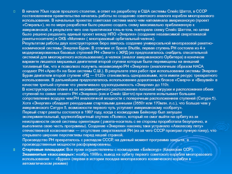 работы по созданию советского аналога корабля многоразового использования. В начальных проектах советская система мало чем напоминала американскую (проект «Спираль»), но по мере разработки было решено создать схему максимально приближенную к американской, в результате чего она практически точь-в-точь повторяла схему Спейс Шаттла, но затем было решено разделить единый проект между НПО «Энергия» (создание независимой сверхтяжелой ракеты-носителя) и ОКБ «Молния» ( многоразовый орбитальный челнок).
