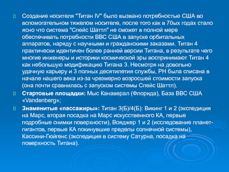 что система "Спейс Шаттл" не сможет в полной мере обеспечивать потребности ВВС США в запуске орбитальных аппаратов, наряду с научными и гражданскими заказами. Титан 4 практически идентичен более ранней версии Титана, в результате чего многие инженеры и историки космической эры воспринимают Титан 4 как небольшую модификацию Титана 3. Несмотря на довольно удачную карьеру и 3 полных десятилетия службы, РН была списана в начале нашего века из-за чрезмерно возросшей стоимости запуска (она почти сравнилась с запуском системы Спейс Шаттл).