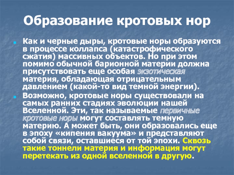 Возможно, кротовые норы существовали на самых ранних стадиях эволюции нашей Вселенной. Эти, так называемые первичные кротовые норы могут составлять темную материю. А может быть, они образовались еще в эпоху «кипения вакуума» и представляют собой связи, оставшиеся от той эпохи. Сквозь такие тоннели материя и информация могут перетекать из одной вселенной в другую.