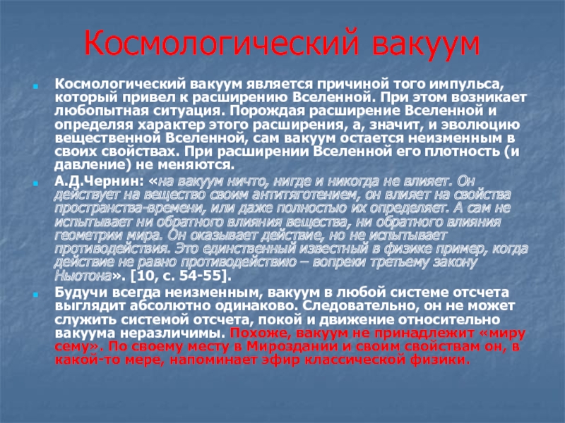 А.Д.Чернин: «на вакуум ничто, нигде и никогда не влияет. Он действует на вещество своим антитяготением, он влияет на свойства пространства-времени, или даже полностью их определяет. А сам не испытывает ни обратного влияния вещества, ни обратного влияния геометрии мира. Он оказывает действие, но не испытывает противодействия. Это единственный известный в физике пример, когда действие не равно противодействию – вопреки третьему закону Ньютона». [10, с. 54-55].