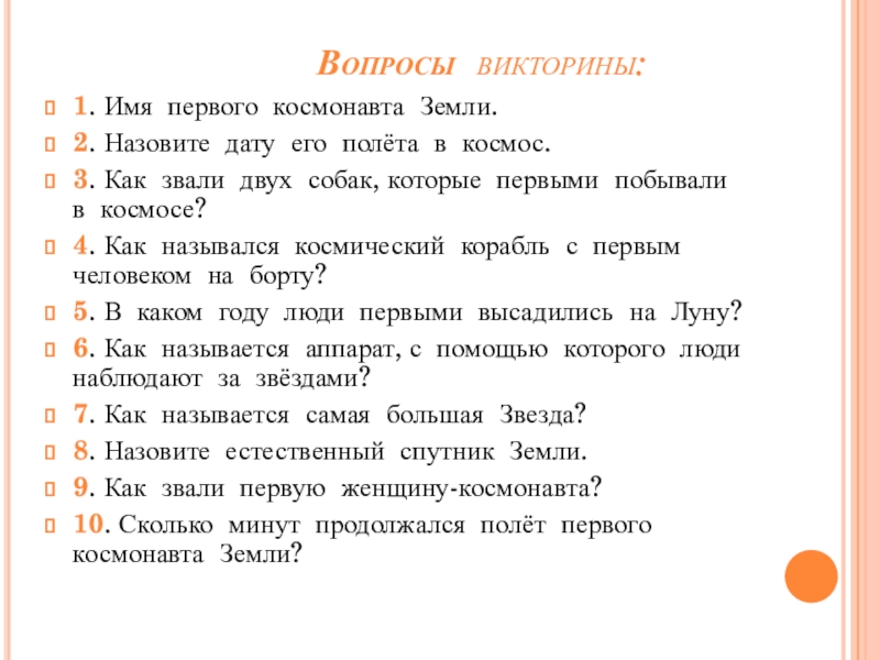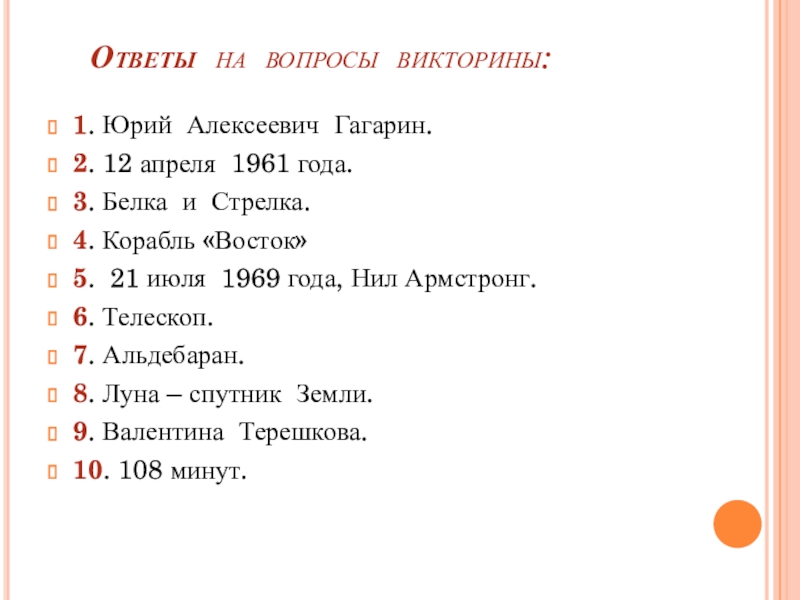 10. Сколько минут продолжался полёт первого космонавта Земли?