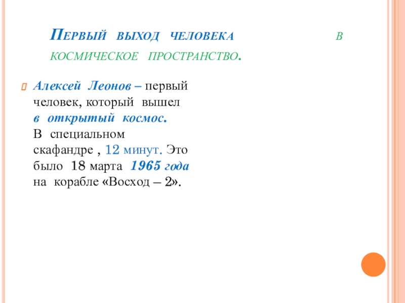 который вышел в открытый космос. В специальном скафандре , 12 минут. Это было 18 марта 1965 года на корабле «Восход – 2».