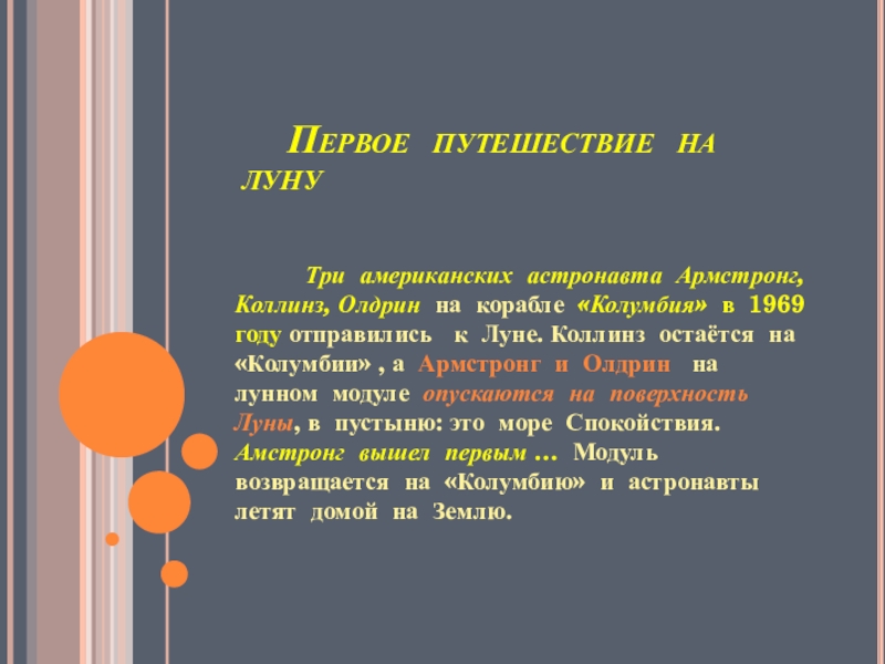 1969 году отправились к Луне. Коллинз остаётся на «Колумбии» , а Армстронг и Олдрин на лунном модуле опускаются на поверхность Луны, в пустыню: это море Спокойствия. Амстронг вышел первым … Модуль возвращается на «Колумбию» и астронавты летят домой на Землю.