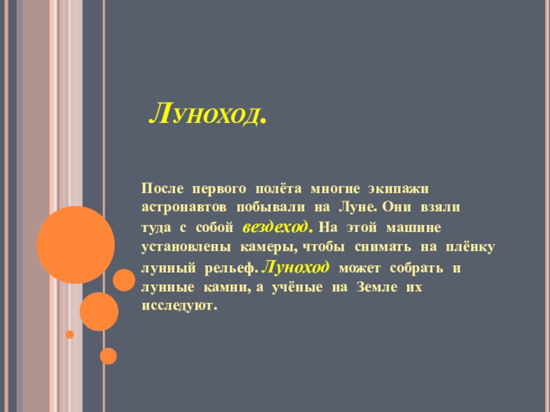 После первого полёта многие экипажи астронавтов побывали на Луне. Они взяли туда с собой вездеход. На этой машине установлены камеры, чтобы снимать на плёнку лунный рельеф. Луноход может собрать и лунные камни, а учёные на Земле их исследуют.