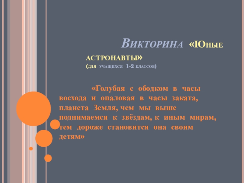 «Голубая с ободком в часы восхода и опаловая в часы заката, планета Земля, чем мы выше поднимаемся к звёздам, к иным мирам, тем дороже становится она своим детям»