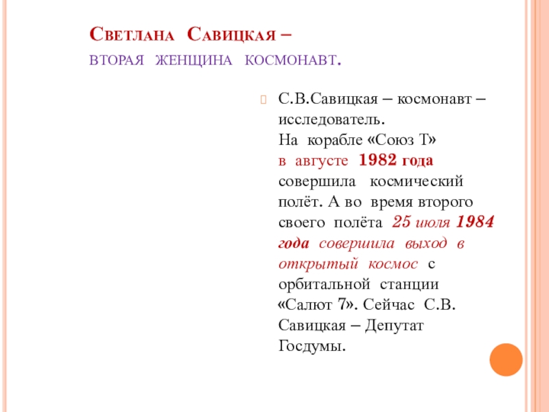 С.В.Савицкая – космонавт – исследователь. На корабле «Союз Т» в августе 1982 года совершила космический полёт. А во время второго своего полёта 25 июля 1984 года совершила выход в открытый космос с орбитальной станции «Салют 7». Сейчас С.В.Савицкая – Депутат Госдумы.
