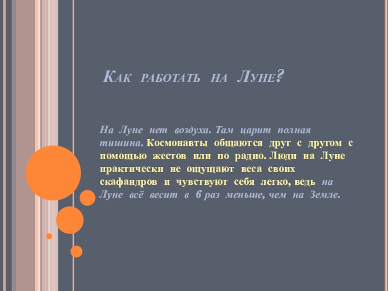 по радио. Люди на Луне практически не ощущают веса своих скафандров и чувствуют себя легко, ведь на Луне всё весит в 6 раз меньше, чем на Земле.