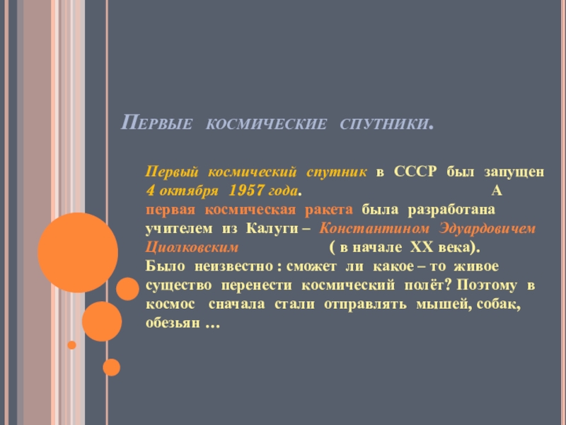 А первая космическая ракета была разработана учителем из Калуги – Константином Эдуардовичем Циолковским ( в начале ХХ века). Было неизвестно : сможет ли какое – то живое существо перенести космический полёт? Поэтому в космос сначала стали отправлять мышей, собак, обезьян …