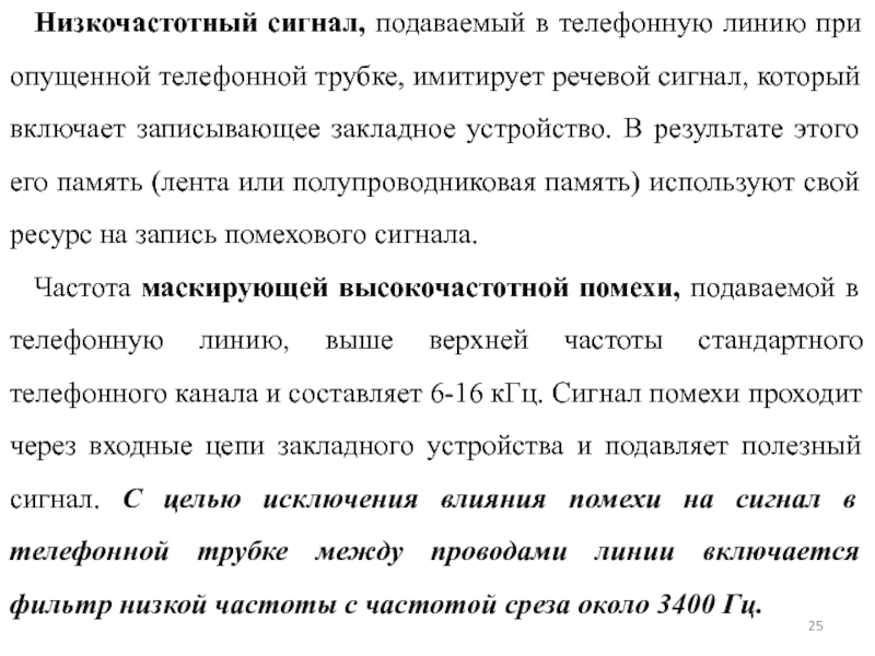 Частота маскирующей высокочастотной помехи, подаваемой в телефонную линию, выше верхней частоты стандартного телефонного канала и составляет 6-16 кГц. Сигнал помехи проходит через входные цепи закладного устройства и подавляет полезный сигнал. С целью исключения влияния помехи на сигнал в телефонной трубке между проводами линии включается фильтр низкой частоты с частотой среза около 3400 Гц.