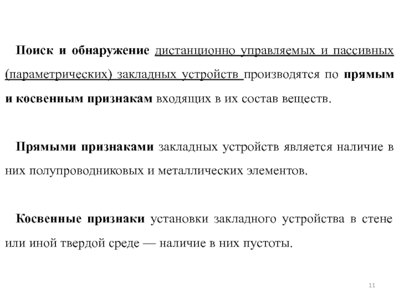 Слайд 11Поиск и обнаружение дистанционно управляемых и пассивных (параметрических) закладных устройств