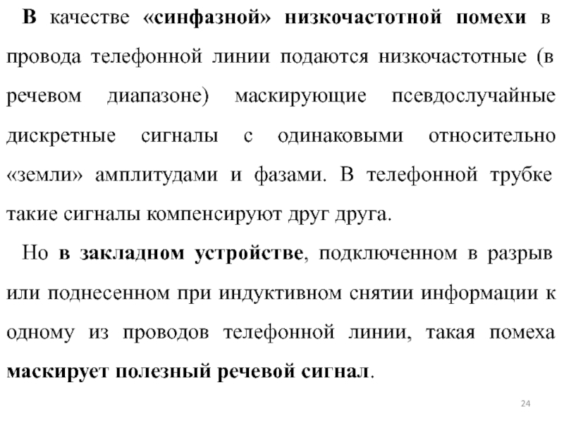 Слайд 24В качестве «синфазной» низкочастотной помехи в провода телефонной линии подаются