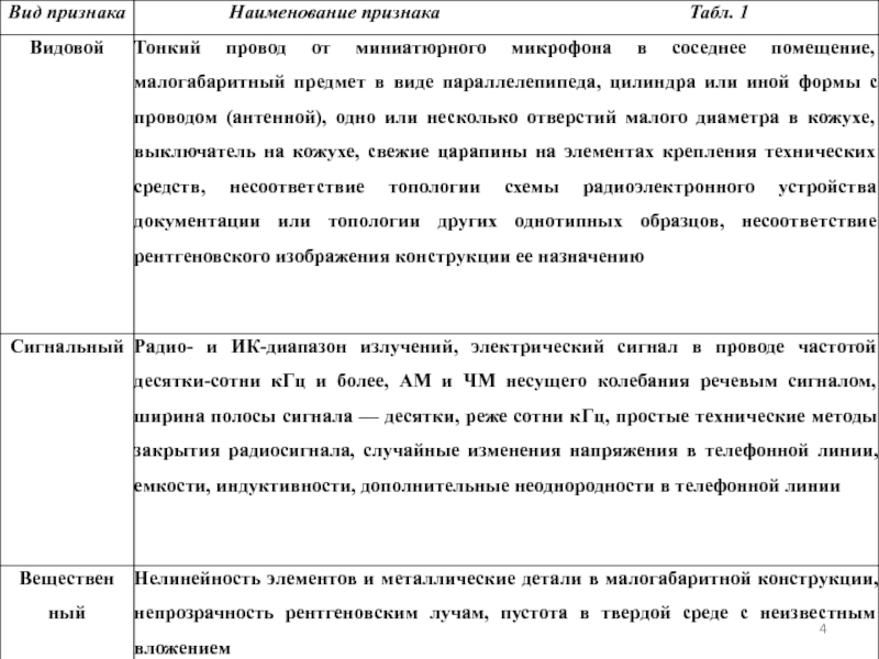 Чем больше демаскирующих признаков в признаковой структуре и чем они информативнее, тем выше вероятность обнаружения объекта. Каждый вид закладных устройств имеет свою признаковую структуру, позволяющую с той или иной вероятностью обнаружить закладку.
