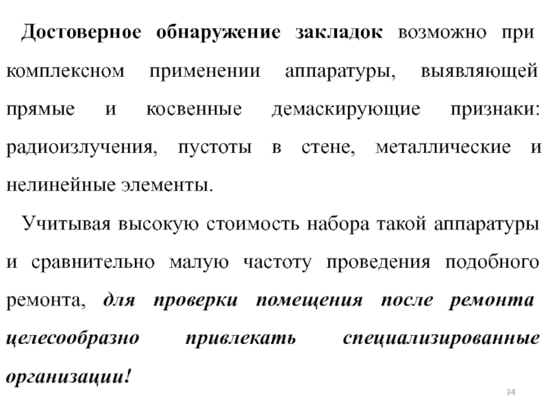 Слайд 34Достоверное обнаружение закладок возможно при комплексном применении аппаратуры, выявляющей прямые