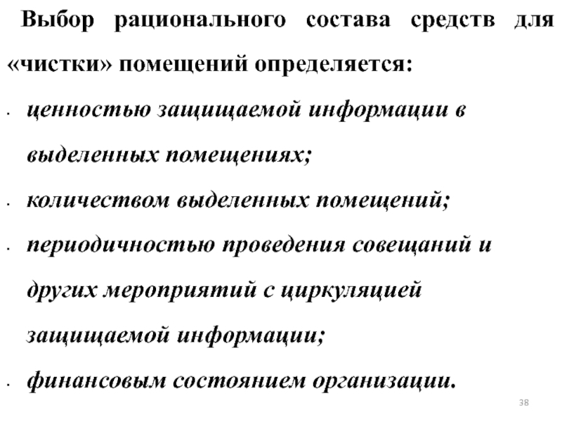 Слайд 38Выбор рационального состава средств для «чистки» помещений определяется: