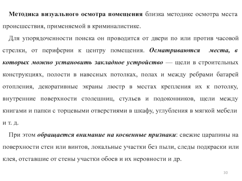 или против часовой стрелки, от периферии к центру помещения. Осматриваются места, в которых можно установить закладное устройство — щели в строительных конструкциях, полости в навесных потолках, полах и между ребрами батарей отопления, декоративные экраны люстр в местах крепления их к потолку, внутренние поверхности столешниц, стульев и подоконников, щели между книгами и папки с торцевыми отверстиями в шкафу, углубления в мягкой мебели и т. д.