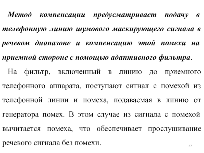 Слайд 27Метод компенсации предусматривает подачу в телефонную линию шумового маскирующего сигнала