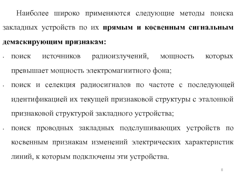 Слайд 8Наиболее широко применяются следующие методы поиска закладных устройств по их