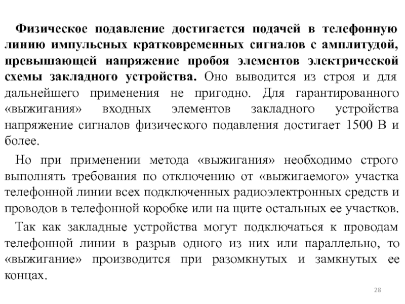 Слайд 28Физическое подавление достигается подачей в телефонную линию импульсных кратковременных сигналов