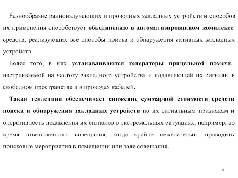 Такая тенденция обеспечивает снижение суммарной стоимости средств поиска и обнаружения закладных устройств по их сигнальным признакам и оперативность подавления их сигналов в экстремальных ситуациях, например, во время ответственного совещания, когда крайне нежелательно проводить поисковые мероприятия в помещении или зале совещания.