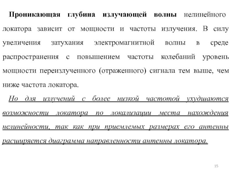 Слайд 15Проникающая глубина излучающей волны нелинейного локатора зависит от мощности и