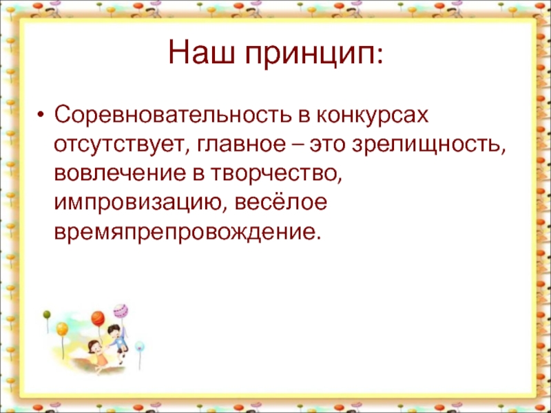 Наш принцип:Соревновательность в конкурсах отсутствует, главное – это зрелищность, вовлечение в творчество, импровизацию, весёлое времяпрепровождение.