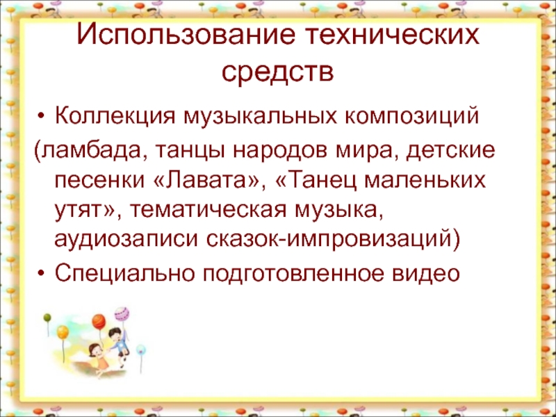 Использование технических средствКоллекция музыкальных композиций(ламбада, танцы народов мира, детские песенки «Лавата», «Танец маленьких утят», тематическая музыка, аудиозаписи