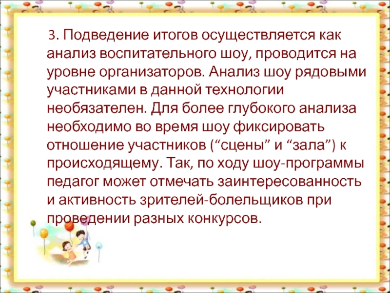 3. Подведение итогов осуществляется как анализ воспитательного шоу, проводится на уровне организаторов. Анализ