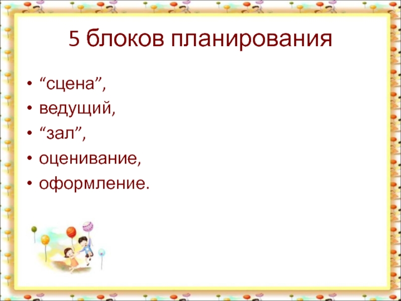 5 блоков планирования“сцена”, ведущий, “зал”, оценивание, оформление.
