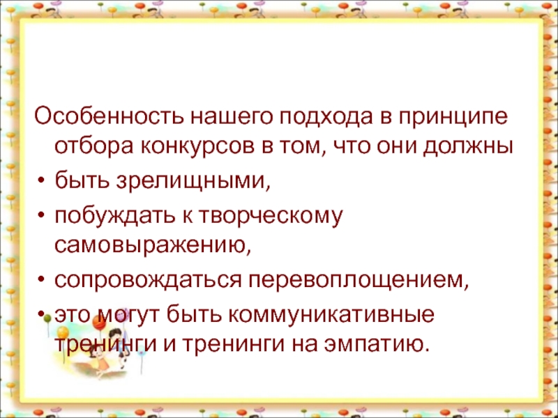 Слайд 14Особенность нашего подхода в принципе отбора конкурсов в том, что