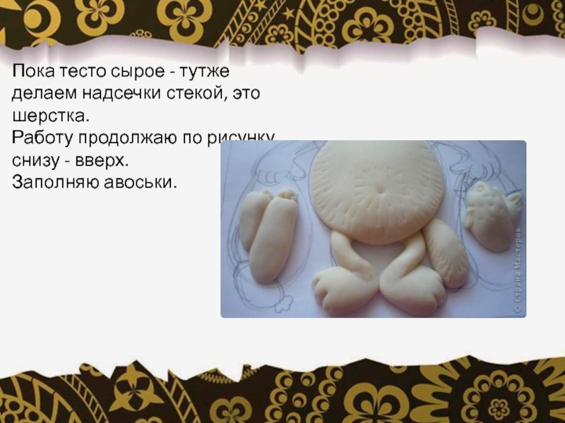 Слайд 7Пока тесто сырое - тутже делаем надсечки стекой, это шерстка.