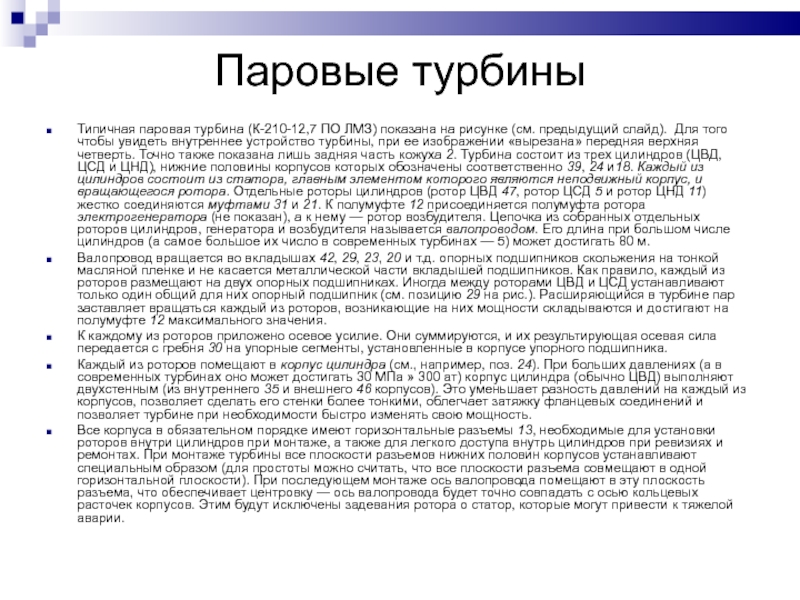 при ее изображении «вырезана» передняя верхняя четверть. Точно также показана лишь задняя часть кожуха 2. Турбина состоит из трех цилиндров (ЦВД, ЦСД и ЦНД), нижние половины корпусов которых обозначены соответственно 39, 24 и18. Каждый из цилиндров состоит из статора, главным элементом которого являются неподвижный корпус, и вращающегося ротора. Отдельные роторы цилиндров (ротор ЦВД 47, ротор ЦСД 5 и ротор ЦНД 11) жестко соединяются муфтами 31 и 21. К полумуфте 12 присоединяется полумуфта ротора электрогенератора (не показан), а к нему — ротор возбудителя. Цепочка из собранных отдельных роторов цилиндров, генератора и возбудителя называется валопроводом. Его длина при большом числе цилиндров (а самое большое их число в современных турбинах — 5) может достигать 80 м.