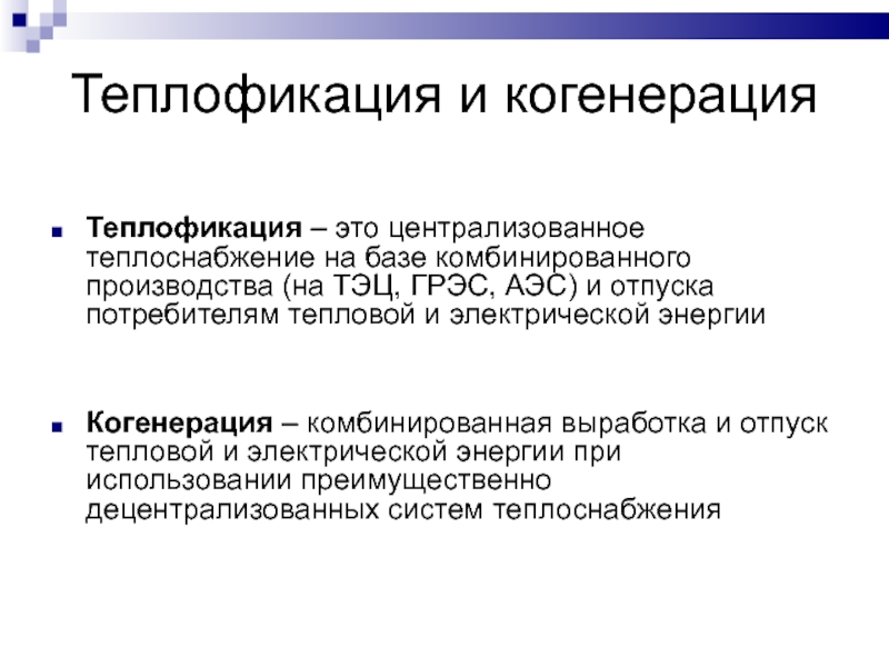 Когенерация – комбинированная выработка и отпуск тепловой и электрической энергии при использовании преимущественно децентрализованных систем теплоснабжения