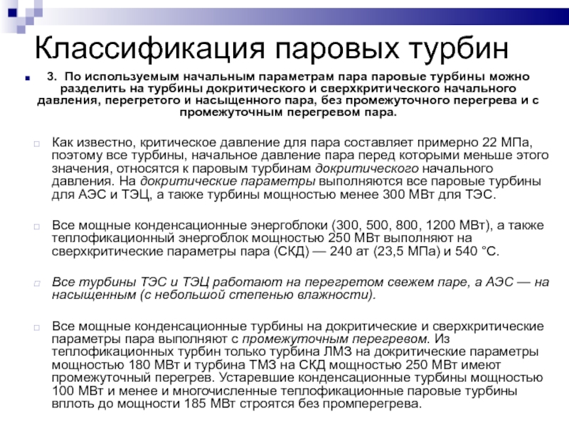 Как известно, критическое давление для пара составляет примерно 22 МПа, поэтому все турбины, начальное давление пара перед которыми меньше этого значения, относятся к паровым турбинам докритического начального давления. На докритические параметры выполняются все паровые турбины для АЭС и ТЭЦ, а также турбины мощностью менее 300 МВт для ТЭС.