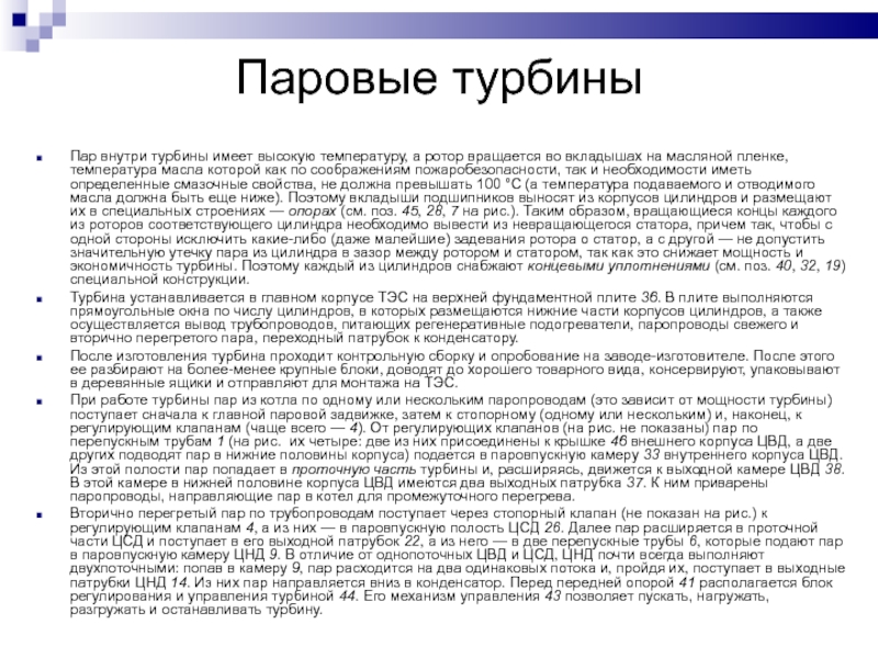 соображениям пожаробезопасности, так и необходимости иметь определенные смазочные свойства, не должна превышать 100 °С (а температура подаваемого и отводимого масла должна быть еще ниже). Поэтому вкладыши подшипников выносят из корпусов цилиндров и размещают их в специальных строениях — опорах (см. поз. 45, 28, 7 на рис.). Таким образом, вращающиеся концы каждого из роторов соответствующего цилиндра необходимо вывести из невращающегося статора, причем так, чтобы с одной стороны исключить какие-либо (даже малейшие) задевания ротора о статор, а с другой — не допустить значительную утечку пара из цилиндра в зазор между ротором и статором, так как это снижает мощность и экономичность турбины. Поэтому каждый из цилиндров снабжают концевыми уплотнениями (см. поз. 40, 32, 19) специальной конструкции.