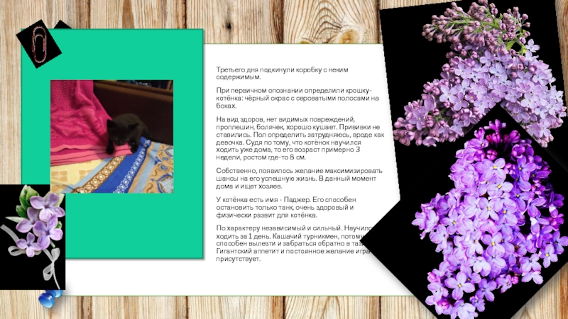 нет видимых повреждений, проплешин, болячек, хорошо кушает. Прививки не ставились. Пол определить затрудняюсь, вроде как девочка. Судя по тому, что котёнок научился ходить уже дома, то его возраст примерно 3 недели, ростом где-то 8 см.