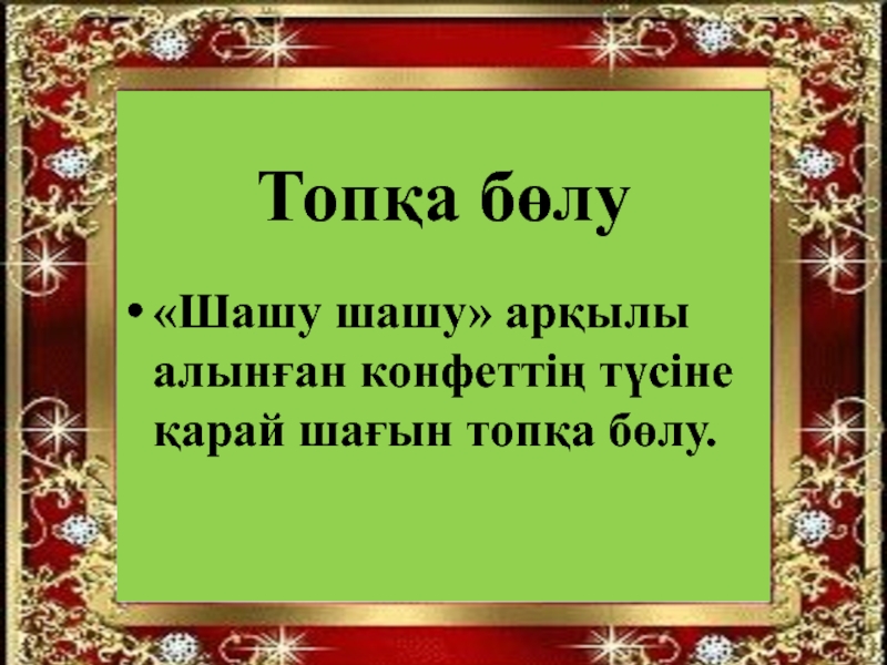 Топқа бөлу«Шашу шашу» арқылы алынған конфеттің түсіне қарай шағын топқа бөлу.