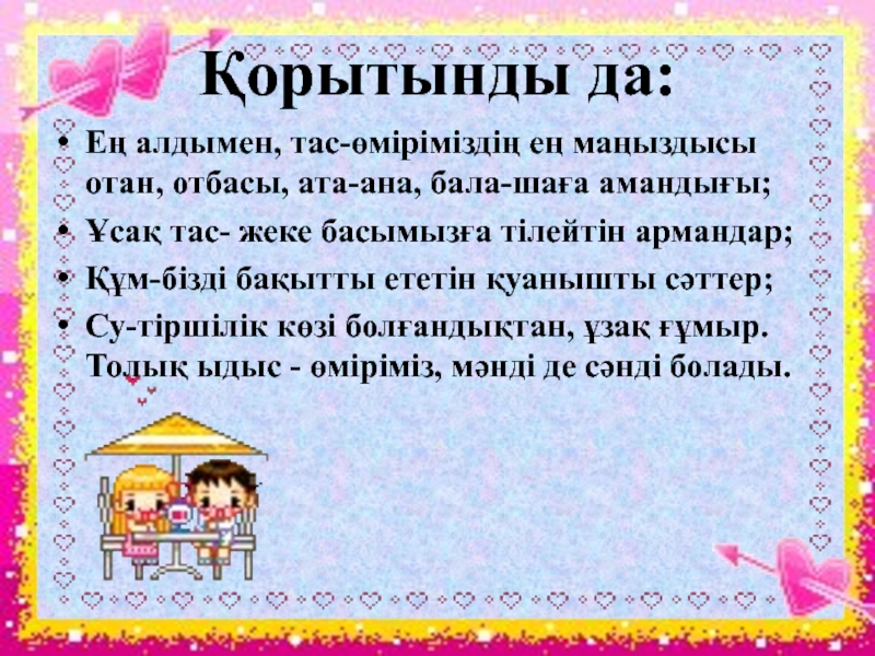 Қорытынды да:Ең алдымен, тас-өміріміздің ең маңыздысы отан, отбасы, ата-ана, бала-шаға амандығы;Ұсақ тас- жеке басымызға тілейтін
