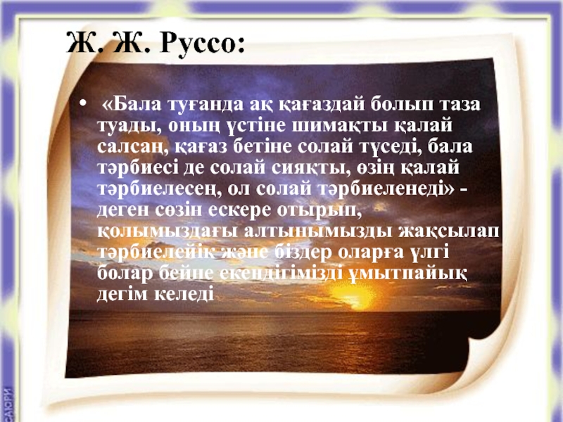 Ж. Ж. Руссо: «Бала туғанда ақ қағаздай болып таза туады, оның үстіне шимақты қалай салсаң, қағаз бетіне