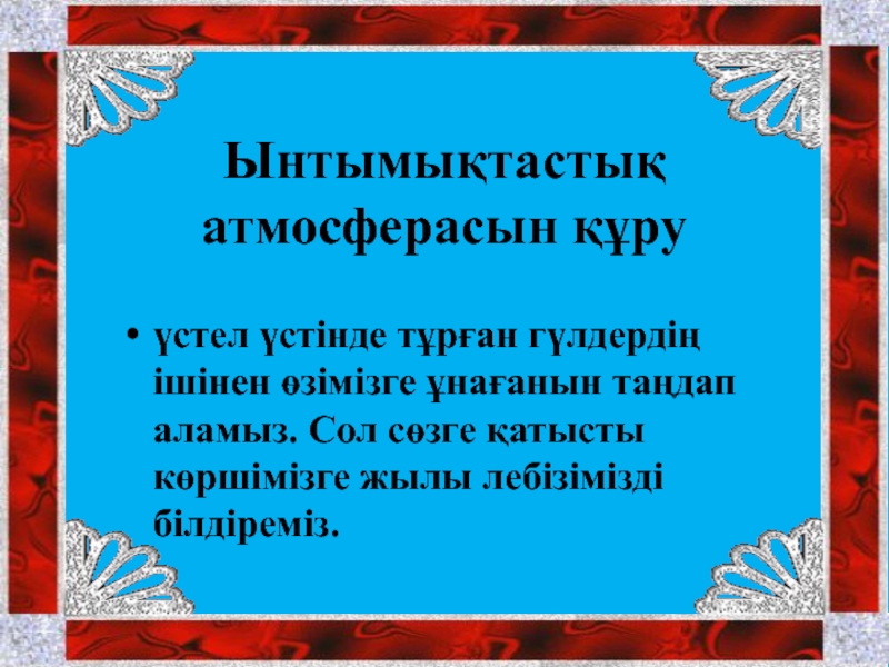 Ынтымықтастық атмосферасын құру үстел үстінде тұрған гүлдердің ішінен өзімізге ұнағанын таңдап аламыз. Сол сөзге қатысты көршімізге
