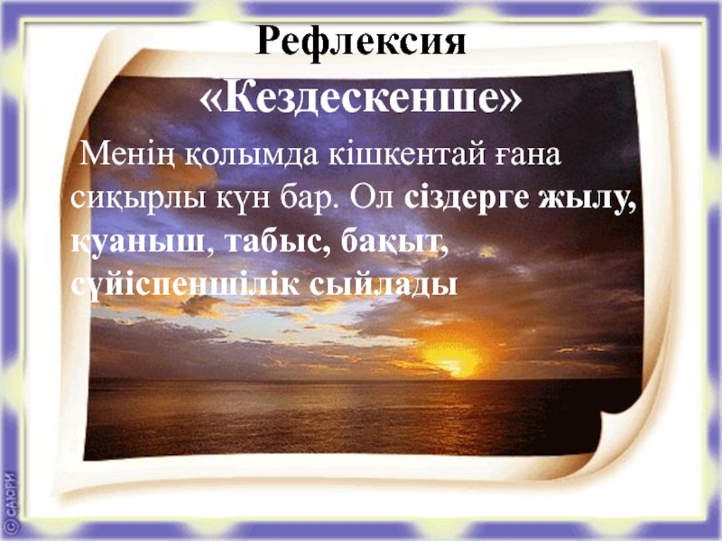 Рефлексия «Кездескенше» Менің қолымда кішкентай ғана сиқырлы күн бар. Ол сіздерге жылу, қуаныш, табыс, бақыт, сүйіспеншілік сыйлады