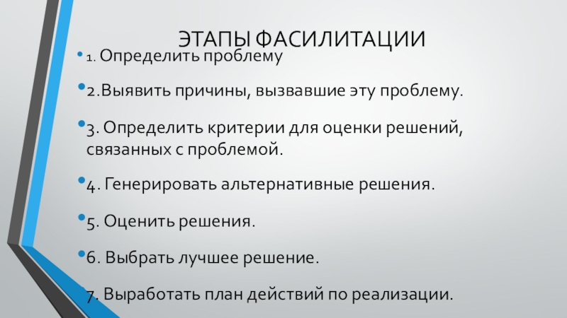 ЭТАПЫ ФАСИЛИТАЦИИ1. Определить проблему2.Выявить причины, вызвавшие эту проблему.3. Определить критерии для оценки решений, связанных с проблемой.4. Генерировать