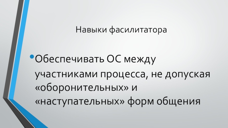 Навыки фасилитатораОбеспечивать ОС между участниками процесса, не допуская «оборонительных» и «наступательных» форм общения