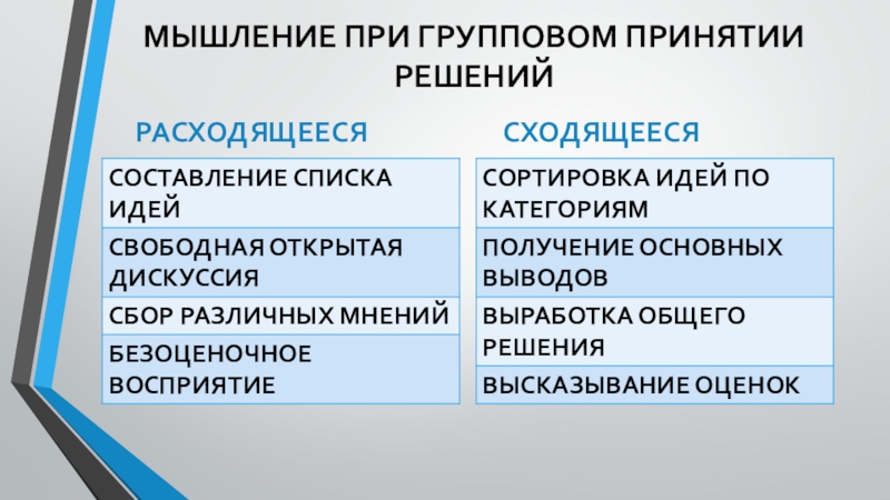 МЫШЛЕНИЕ ПРИ ГРУППОВОМ ПРИНЯТИИ РЕШЕНИЙРАСХОДЯЩЕЕСЯ	СХОДЯЩЕЕСЯ